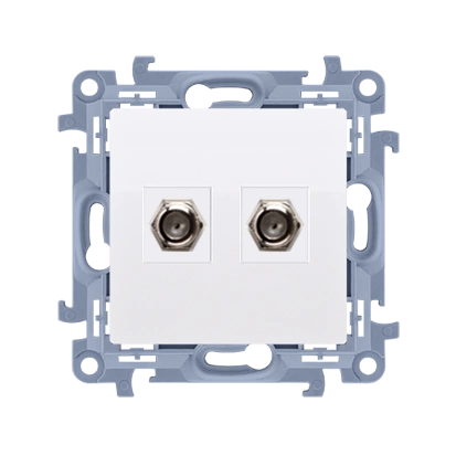 Podwójne złącze antenowe typu F w eleganckim, białym wykończeniu – idealne do instalacji satelitarnych i kablowych w mieszkaniach, biurach i przestrzeniach komercyjnych