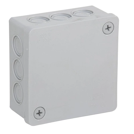 Wyobraź sobie instalację w kotłowni, warsztacie, piwnicy czy pod zadaszeniem na zewnątrz. Potrzebujesz puszki, która **jest kompaktowa, szczelna, estetyczna i daje pełną dowolność konfiguracji**. **Viplast 02303** to **hermetyczna puszka natynkowa w neutralnym szarym kolorze**, o wymiarach **86×86×40 mm**, bez wbudowanych zacisków – dzięki czemu możesz użyć własnych złączek i dopasować układ połączeń do konkretnego zastosowania. Klasa szczelności **IP55** chroni instalację przed kurzem i wodą, nawet w wymagających warunkach.