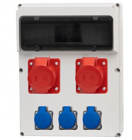 Rozdzielnia posiada 1× 16A 5P, 1× 32A 5P oraz 3× 230V – standardowe i uniwersalne podłączenia. -