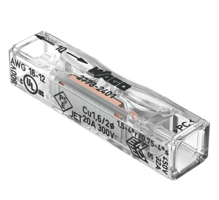 Lead: WAGO 2773-2401 to dwutorowa, kompaktowa szybkozłączka przelotowa przeznaczona do łączenia przewodów jednodrutowych w instalacjach elektrycznych. Dzięki miniaturowym rozmiarom i technologii bezśrubowej montaż złączki jest szybki i bezpieczny, a przezroczysta obudowa umożliwia kontrolę poprawności połączenia.