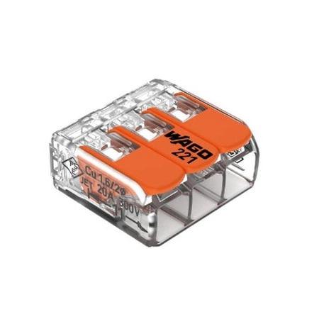 Szybkozłączka Wago 221-413 – przeźroczysty pewniak 3 × 0,14-4 mm2, który łączy linkę i drut w mgnieniu oka
