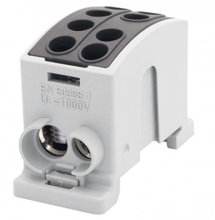 HLK 125A-2 to przemysłowy zacisk szynowy do szyny DIN 35 mm, obsługujący prądy do 125 A. Wyposażony w dwie pary przyłączy: 1x35 mm2 i 1x25 mm2 po każdej stronie. Czarna obudowa pozwala na uniwersalne zastosowanie – zarówno do fazy, neutralnego, jak i obwodów DC lub sygnałowych. Idealny do zasilania rozdzielnic i urządzeń dużej mocy.