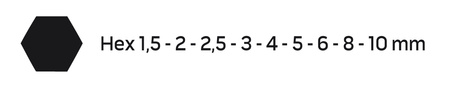 - Klucze HEX z końcówką kulistą: 1.5 / 2 / 2.5 / 3 / 4 / 5 / 6 / 8 / 10 mm
