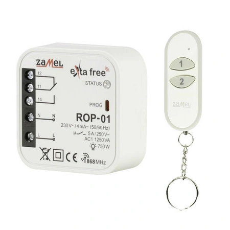 Zestaw Zamel RZB-05 składa się z bezprzewodowego nadajnika ściennego P257/2 i odbiornika ROP01 montowanego w puszce O60 mm. Pozwala sterować oświetleniem i innymi odbiornikami bez konieczności prowadzenia kabli sterujących. Współpracuje z systemem EXTA FREE, oferując pięć trybów pracy: monostabilny, bistabilny, czasowy i inne.