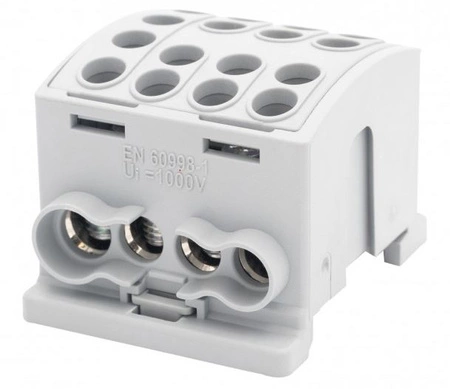 HLK 125A-4 w wersji szarej to złączka do zadań specjalnych – technicznych, uniwersalnych, DC lub projektów OEM. Z konfiguracją 1x35 mm2 + 3x25 mm2 po każdej stronie oraz prądem znamionowym 125 A umożliwia bezpieczne i przejrzyste rozdzielenie obwodów w dużych rozdzielnicach lub szafach automatyki.